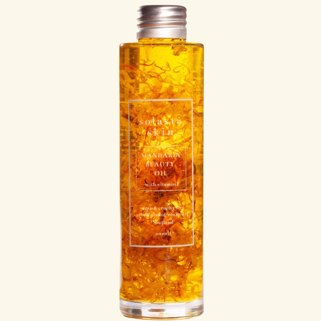 Introducing a burst of sunshine in a bottle. Say hello to Mandarin Marigold Beauty Oil, the newest addition to the Solasta Skin range. Uplifting and zesty, with a sweet mandarin scent, this beauty oil brings tropical spa vibes straight to your home. Organic marigolds are infused in a handpicked blend of restorative oils, allowing the oils to absorb all their benefits and the stunning floral + citrus fragrance. Sweet mandarin oil is packed with antioxidants, known for its skin-brightening and nourishing properties.